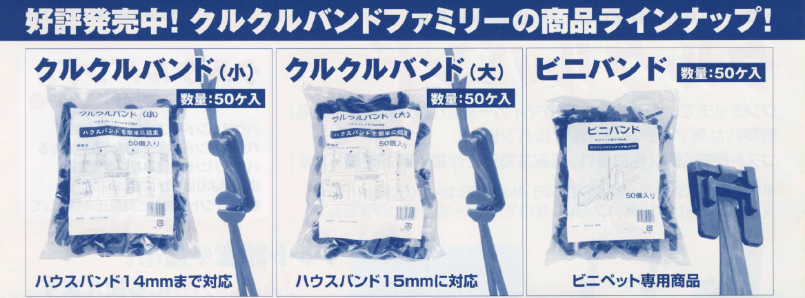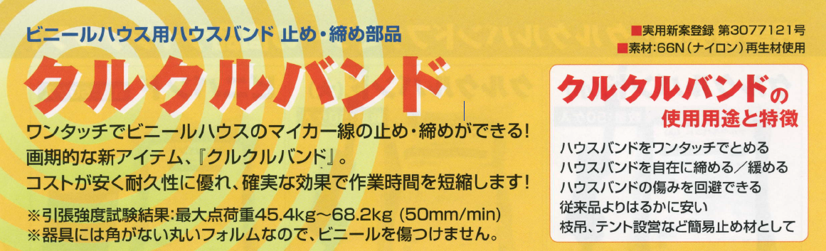 クルクルバンド、ビニバンドは、ワンタッチでビニールハウスのマイカー線の止め・絞めができる画期的な新アイテムです。コストが安く耐久性に優れ、確実な効果で作業時間を短縮できます。